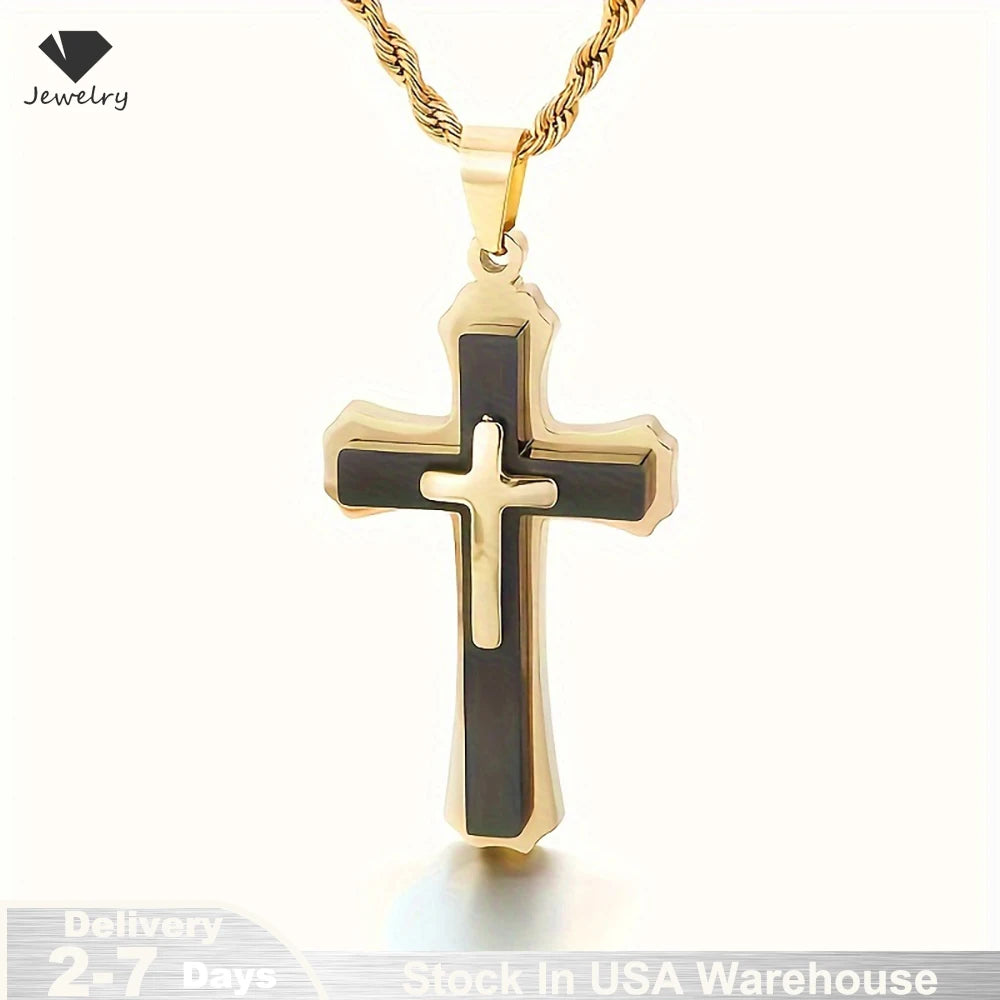 14K Gold Plated Men's Three-Layer Cross Necklace Hip Hop European Style Trendy Accessory Pendant Daily Jewelry Accessories USA