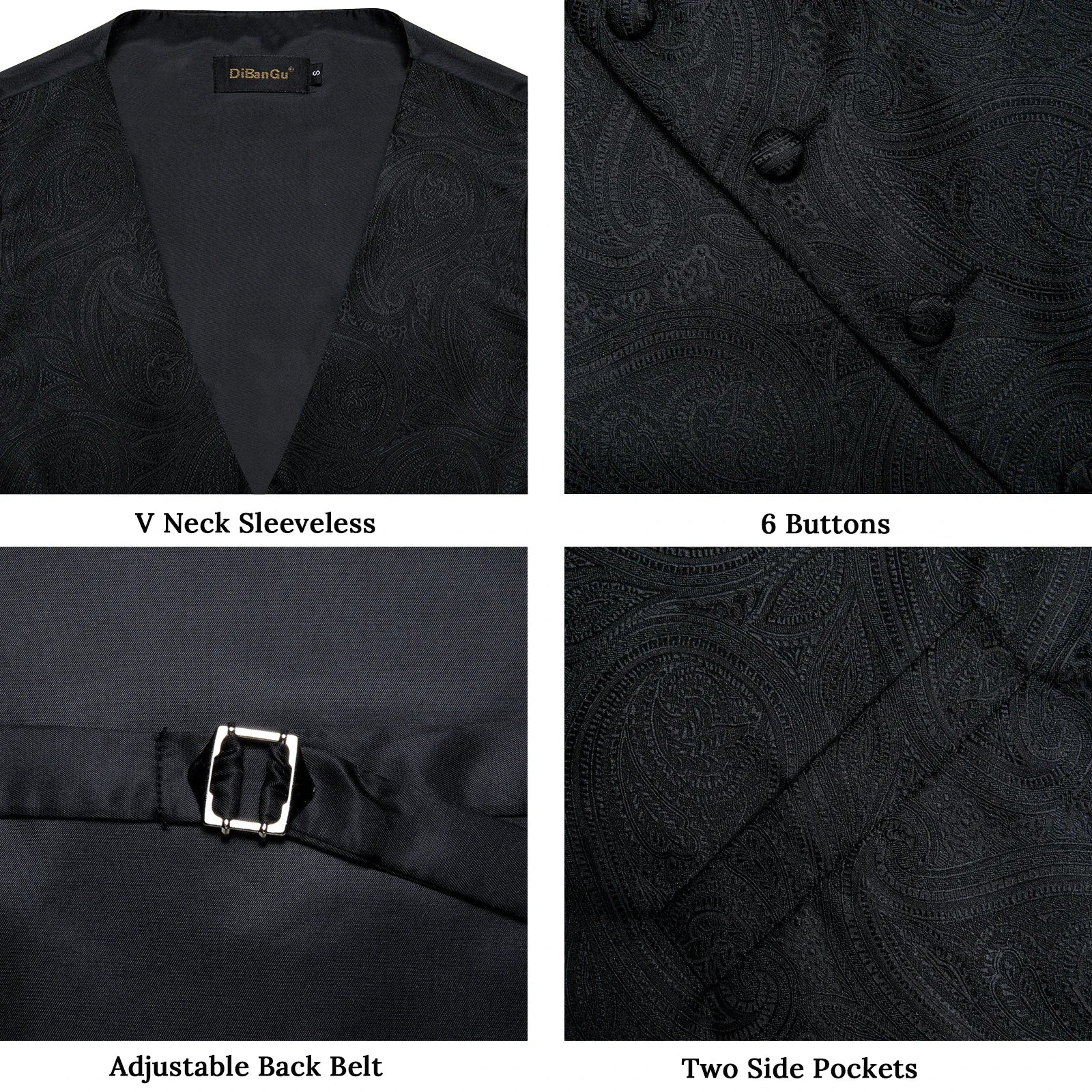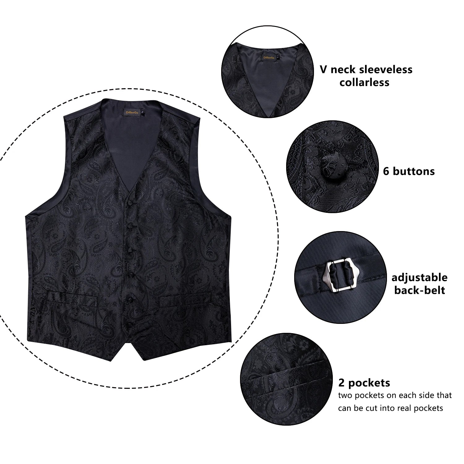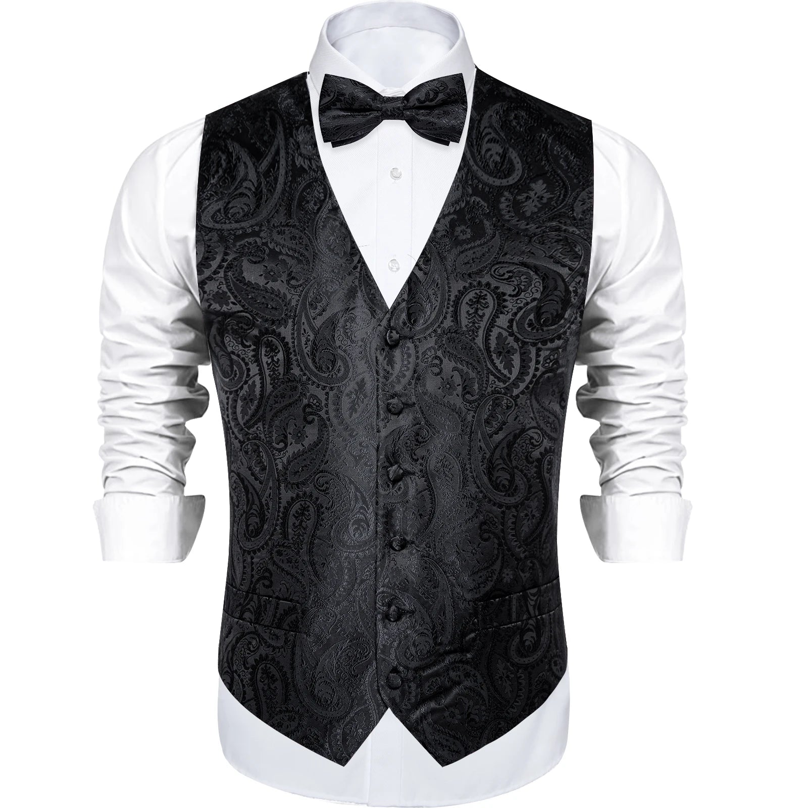 Men's Black Solid Paisley Suit Vest with Necktie Bow Tie Handkerchief Cufflinks Formal Waistcoat for Wedding Prom Tuxedo