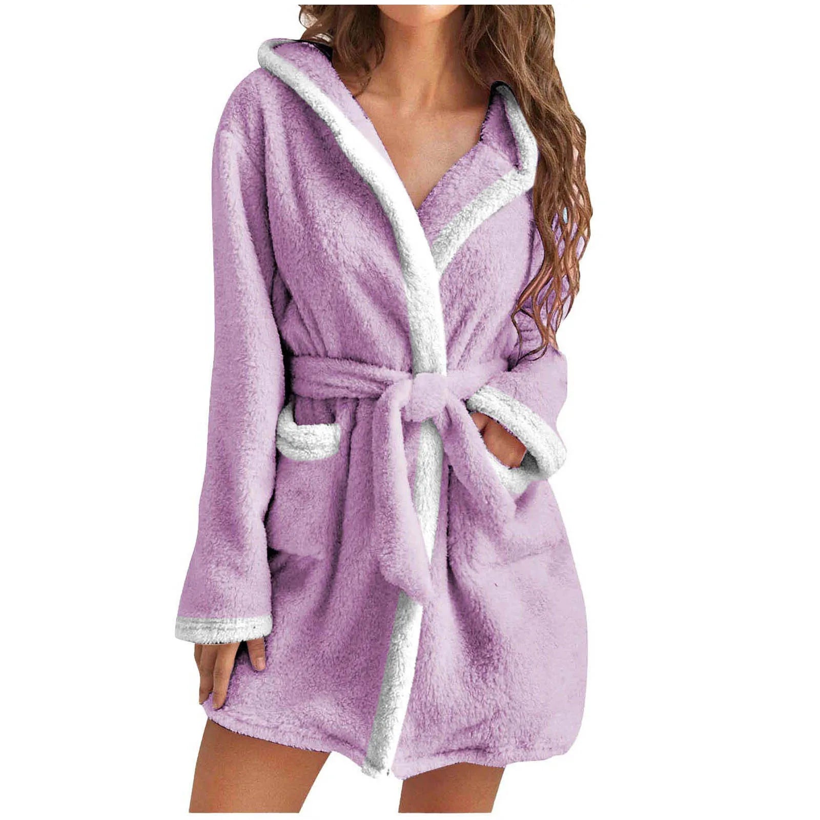 Women Coral Fleece Bathrobe Autumn And Winter Home Warm Sleepwear Casual Solid Color Matching Shower Robes Hooded Kimono Robe
