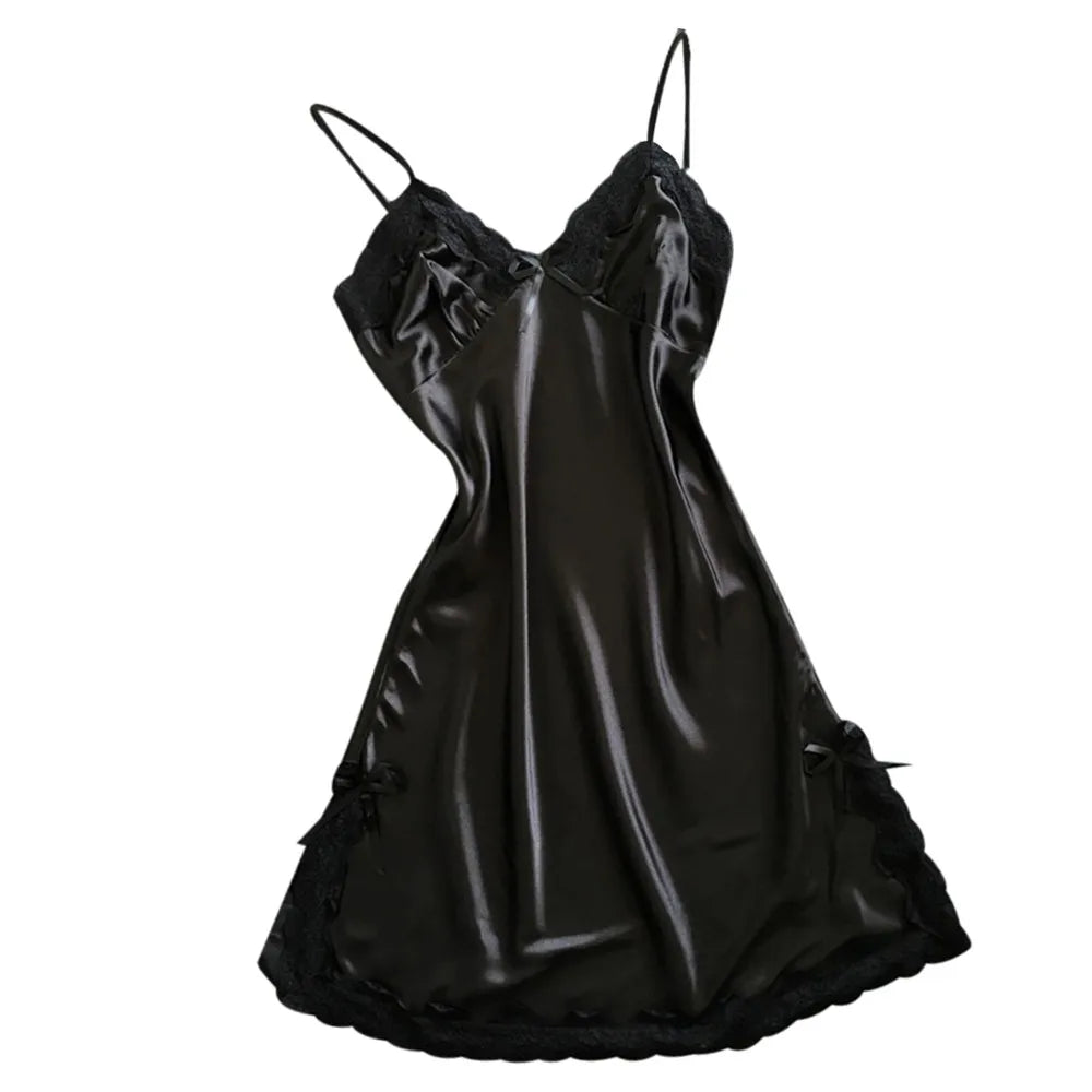Women Red Satin Sexy Babydolls Bowknot Lace V Neck Sling Lingerie Sexy Nightwear Lightweight Ladies Home Clothed Erotic Pajamas