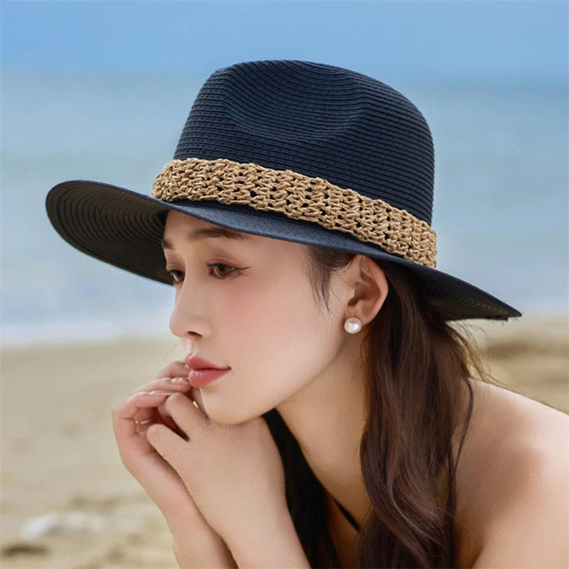 Women Wide Brim Sun Hat with Bowknot Ribbon Summer Beach Straw Hat Foldable Floppy Fedora Hat for Vacation Travel Party Clothes